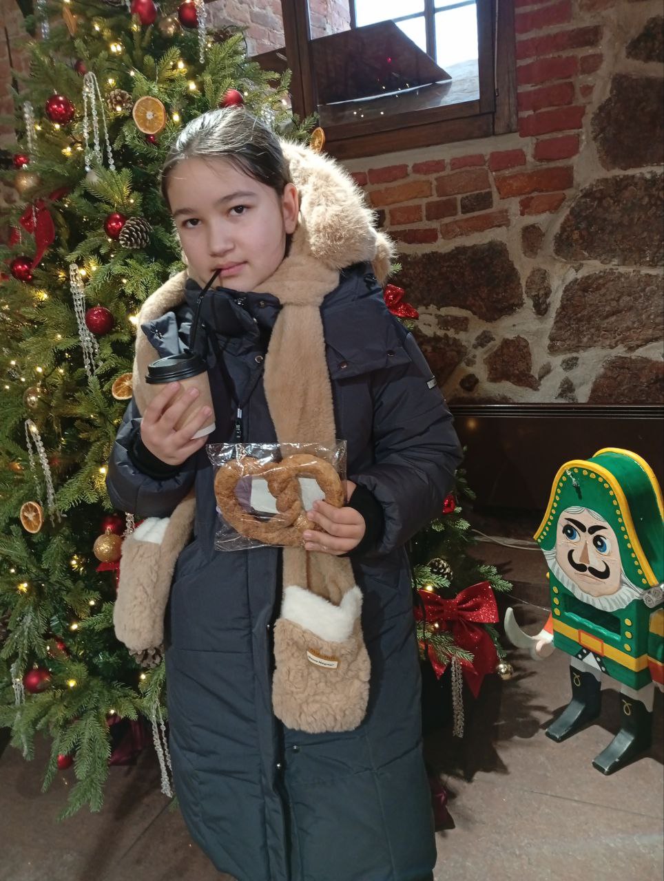 Девочка рассказывает, что в Санкт-Петербург она ездила вместе с мамой. Посетили легендарный музей Эрмитаж, океанариум, Ленинградский зоопарк, Петропавловскую крепость, Московский цирк, музей Фаберже. Также съездили в старинный город Выборг, где посетили средневековый Выборгский замок, познакомились с его историей, попробовали знаменитый выборгский крендель, побывали в музее шоколада, приняли участие в мастер-классах по изготовлению молочного шоколада и выпечке кренделя, побывали на выборгской рождественской ярмарке.