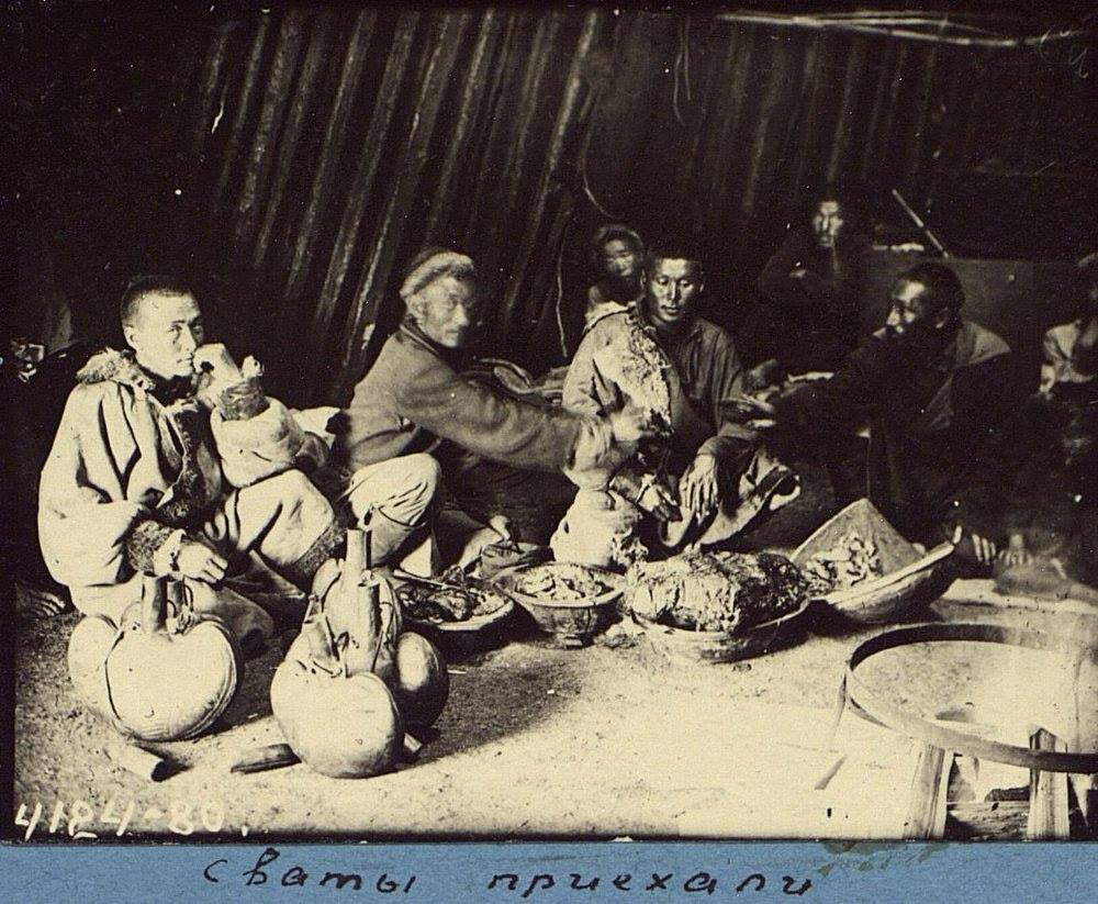 Но так как тогда не было денег, то калым исчисляли единицами счета домашнего скота – подо, или бодо. У челканцев в единицу «подо» входили долбленая лодка и сеть из кендыря (дикая конопля) длиною 3 аршина. Также к одному подо приравнивались две палочки (кый) длиной от груди до конца вытянутой руки взрослого мужчины, на которые нанизаны сушеные тушки зверька сыирган (сеноставка). Кроме того, единицу «подо» составляла берестяная коробка, наполненная колобками (токчок), приготовленными из толченого кедрового ореха, смешанного с толокном. Объем коробки значения не имел, а мерилом был ее вес. Вес колобков для одного «подо» должен был составлять столько, сколько мог поднять их в заплечной ноше сидящий человек, поднимаясь с земли на ноги, придерживаясь за топор, воткнутый в пень. Решето табаку также составляло «подо». Съедобные же корни, мясо зверей, кроме упомянутого сыиргана, в «подо» челканцев не входили. В уплату за калым у челканцев требовалось отдать три «подо»: 1) лодку с сетью; 2) сушеное мясо сеноставки; 3) колобки из кедрового ореха. Кроме того, зять обязывался доставлять систематически родителям жены мясо зверей, убитых им на охоте. Челканцы также утверждают, что «в ойратское время» у них не было обычая давать с невесткой приданое, что это обыкновение возникло недавно, т. е. уже в период подданства их России. У тубаларов единица «подо» аналогично была связана с определенными натуральными предметами, продуктами, идущими в уплату калыма. Таковыми являлись: 1) сушеное мясо сеноставки, нанизанное на палочки; 2) колобки из кедрового ореха; 3) снизки сушеных клубней кандыка и луковиц сараны. Здесь также зять был обязан добывать мясо зверей для тестя. Однако старики-тубалары утверждают, что у них «в ойратское время» существовал не только калым, но и приданое невесты (кыстын енчизи), состоявшее из мотыги-корнекопалки (озык), одежды, постели, посуды. Уплата калыма кореньями диких съедобных растений, по сообщению китайской летописи, существовала уже в VI в. среди уйгурского поколения Дубо, обитавшего между верховьями Енисея и оз. Косоголом. У Дубо богатые при свадьбе давали лошадей, а бедные приносили оленьи кожи и саранные коренья.